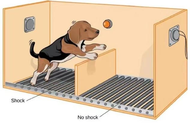 后续,研究者将所有狗放入一个特殊装置 —— 一个大铁笼,中间用挡板分隔成两块区域,一侧通电、一侧断电,也就是说,只要狗跳过挡板,就能立刻免受电击之苦。