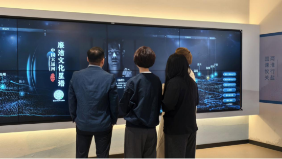 馆内设有全国首个系统展示大运河廉洁文化的数字平台——“中国大运河廉洁文化星谱”。该展览以新华智云AIGC技术为支撑,通过3D全景呈现与大数据挖掘,将运河沿岸27座城市的廉洁文化资源转化为可交互的数字星图。教师党员点击屏幕,即可穿越时空,近距离“触摸”对应城市的廉洁地标,感受发生在运河两岸的古今廉洁故事,沉浸式体验 “清慎勤廉” 的价值追求。