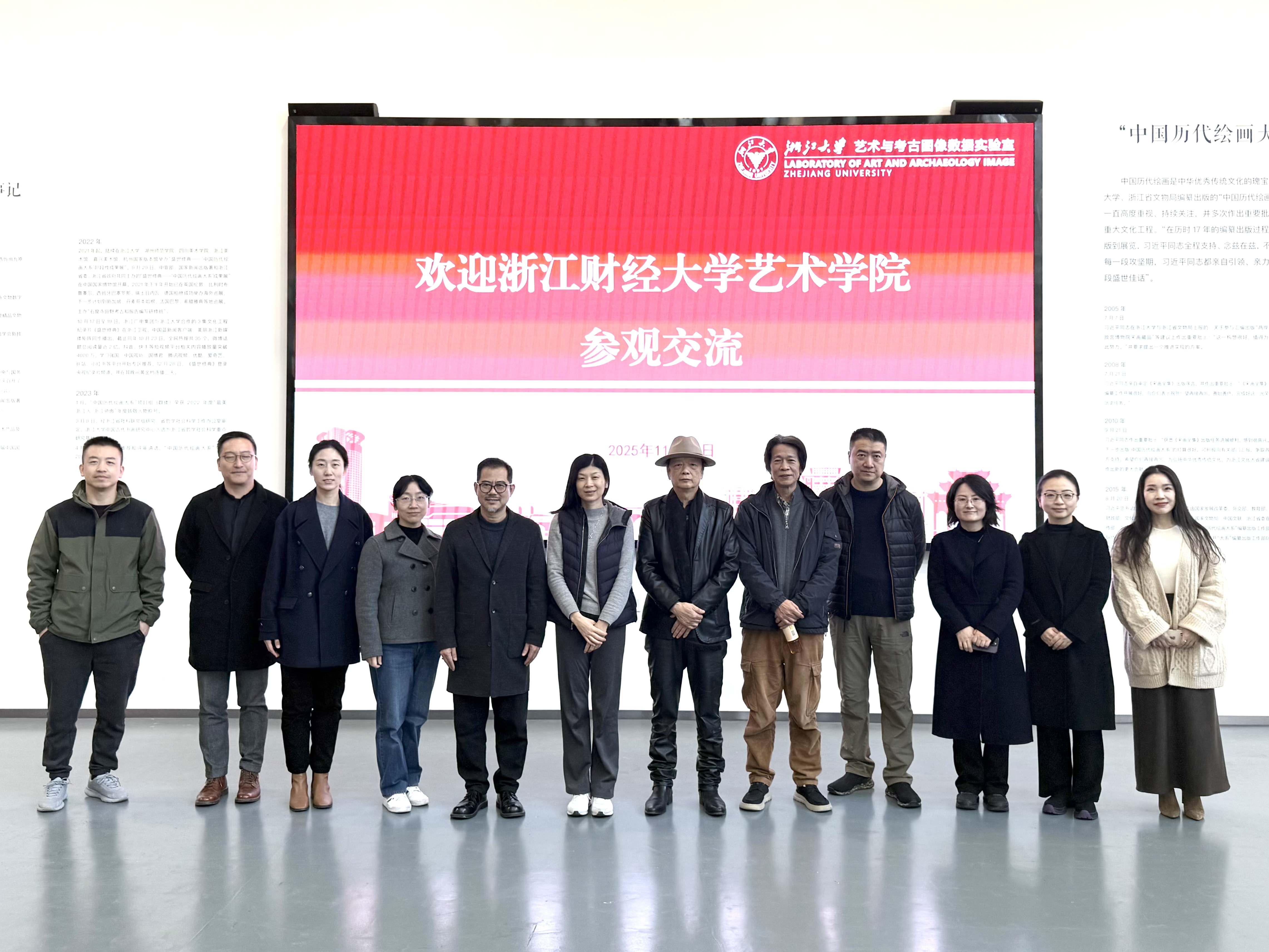 当日下午,考察团一行前往浙江大学西溪校区。浙江大学艺术与考古学院王小松教授、沈华清教授对考察团进行了热情接待。在两位教授的陪同下,考察团实地参观了学院的艺术与考古图像数据实验室和数字影像展厅,亲身体验了先进的数字艺术教学设施与实验环境。随后,双方在会议室举行了座谈。王小松教授与沈华清教授向考察团全面分享了浙江大学在艺术与科技专业领域的建设历史、发展路径、核心办学经验以及标志性成果。双方围绕专业建设中的共性问题与未来发展趋势展开了轻松而深入的对话,交流过程融洽且富有成效。